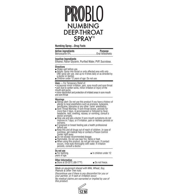 Pro Blo deep throat numbing spray is often found on adult movie sets. It's anesthetic Benzocaine effective numbing action reduces sensation in the back of the throat and suppresses the gag reflex allowing the giver to really give!How to use blowjob spray